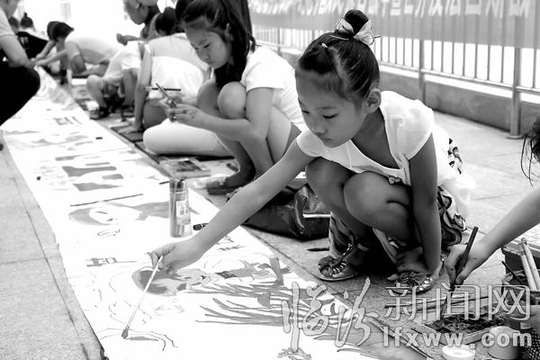 在浮山县文体广场举办的少儿绘画比赛中,儿童们用他们天马行空的想像力和灵巧的画笔还原心中的抗战英雄。崔建华摄