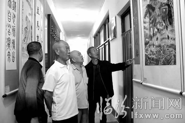 在曲沃县老干部局举办的“纪念中国抗战70周年和世界反法西斯战争胜利”为主题的书画展中,社会各界书画爱好者正在观看书画作品。张荣摄