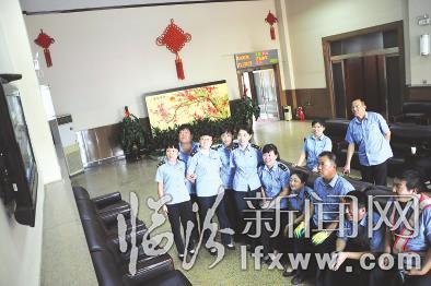 上午9时,在临汾火车站贵宾室内,刚刚下了夜班的车站工作人员聚集在电视机前收看阅兵式。