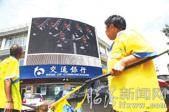 阅兵式当日,市区街头的多个大屏幕对阅兵式进行了转播,许多市民驻足观看。