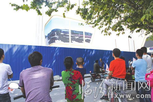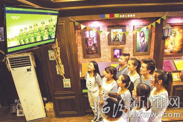 体育南街巴拉嘟嘟影楼的员工挤在一起观看阅兵式。