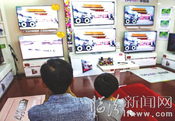 在一家电视专卖店里,一对父子正在观看阅兵式。