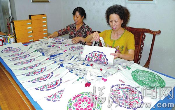 临汾新闻网讯 日前,省级非物质文化遗产“平阳印染布艺”传承人郭素勤(右一)正在整理参加“2015上海合作组织国家商品展”的参展作品。近期,市妇联组织了工艺编织、布艺以及剪纸等巾帼创业团体代表我省参加在“2015上海合作组织国家商品展”期间举办的“指尖上巾帼梦”,展示巾帼创业就业成果与风采。记者 闫锐鹏摄