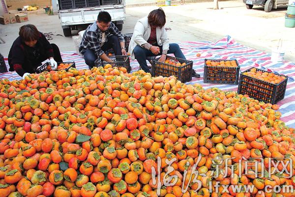 临汾新闻网讯 近日,在曲沃县磨盘岭农业观光区,70余亩黄里透红的甜柿子挂满枝头,这里产的甜柿子肉质松脆、口味甘甜。国庆节期间,园里随处可见自采自摘的游客,同时还吸引了不少外地客商前来购买。图为工人们正在给柿子挑选装箱。张荣摄