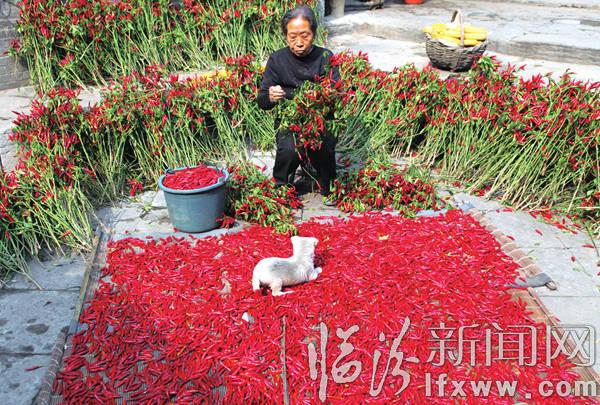 临汾新闻网讯 眼下到了辣椒收获的季节,襄汾县丁村农民忙着采收、晾晒辣椒,家家户户小院里一派忙碌的景象,一簇簇火红的辣椒映红了农民的笑脸。图为该村李大妈正在摘辣椒。张旦 摄