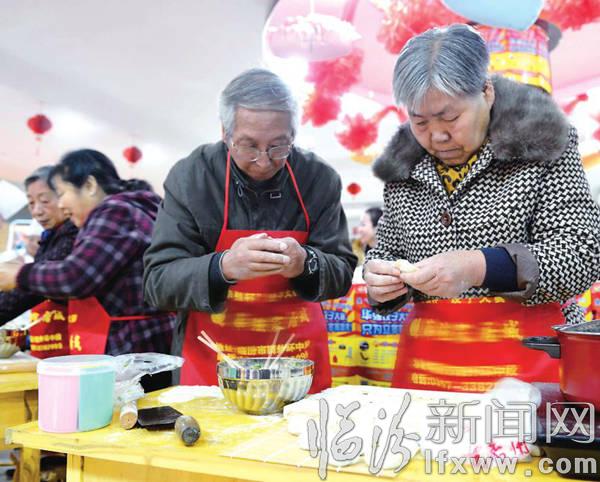 临汾新闻网讯 近日,我市多家爱心企业和不少爱心人士走上街头,举行了“这个冬天不会冷”大型送温暖活动,把亲手包的百盒热气腾腾的饺子送到了奉献在一线的环卫工人手中,让她们在寒冷的冬日倍感温暖。图为一对老年夫妻正在包温暖饺子。 张天杰摄