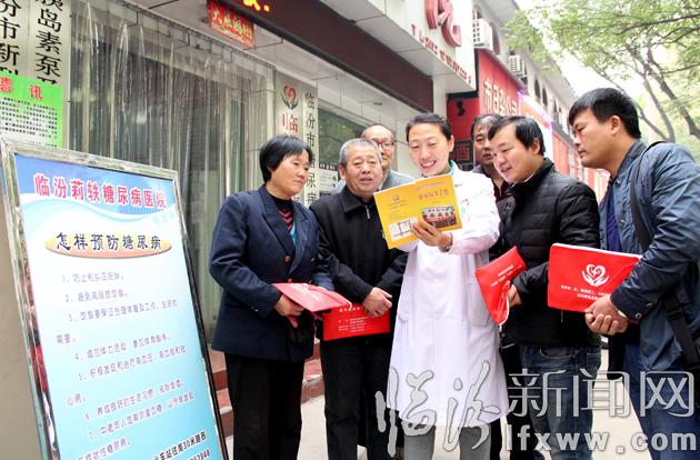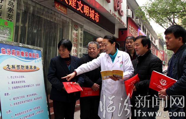 11月13日,临汾莉轶糖尿病医院的医务工作者在为市民讲解糖尿病的预防知识。在11月14日“世界糖尿病日来临之际,由临汾市糖尿病防治学会联合临汾市莉轶糖尿病医院,组织了大型糖尿病防治宣传活动,通过健康知识大讲堂,进社区以及为市民建立健康档案等形式,指导广大市民制定科学防治方法,有效预防糖尿病。