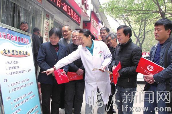 临汾新闻网讯 在11月14日“世界糖尿病日来临之际,市糖尿病防治学会联合临汾莉轶糖尿病医院,组织开展了大型糖尿病防治宣传活动,通过举办健康知识大讲堂、为市民建立健康档案等形式,指导广大市民制定科学防治方法,有效预防糖尿病。图为11月13日,临汾莉轶糖尿病医院的医务工作者正在为市民讲解糖尿病的预防知识。 本报记者 闫锐鹏 摄