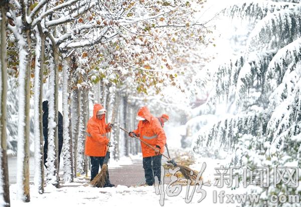 临汾新闻网讯 11月24日,我市迎来今冬首场降雪。图为在临汾市滨河东路,环卫人员正在清扫道路积雪。 记者 张蕴强 摄影报道