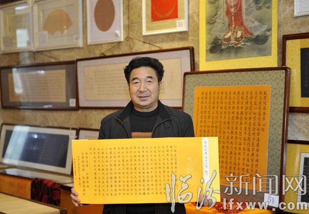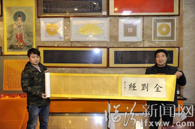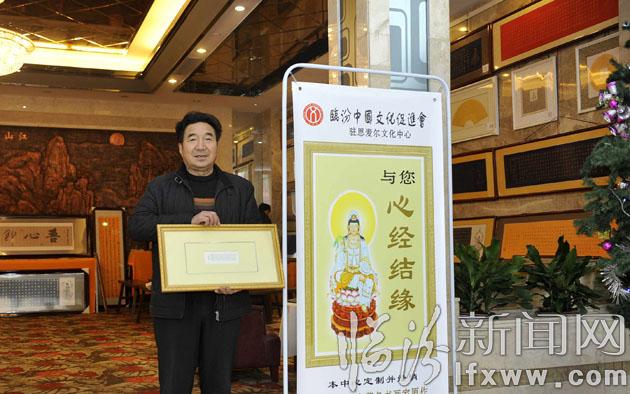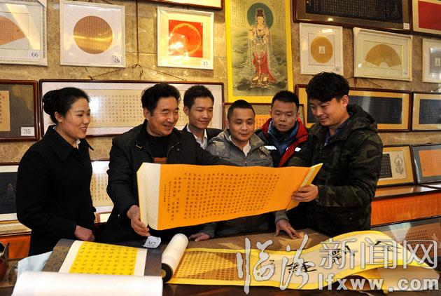 12月24日,在我市思麦尔文化中心,书画策展人倪振亚(左二)在向书画爱好者介绍收藏的心经。近日,临汾中国文化促进会思麦尔文化中心成立,通过定期举办书画交流展、艺术家讲座、传统文化讲座以及书画艺术品推介活动,从而继承和发扬中国的传统文化以及促进我市文化市场的蓬勃发展。