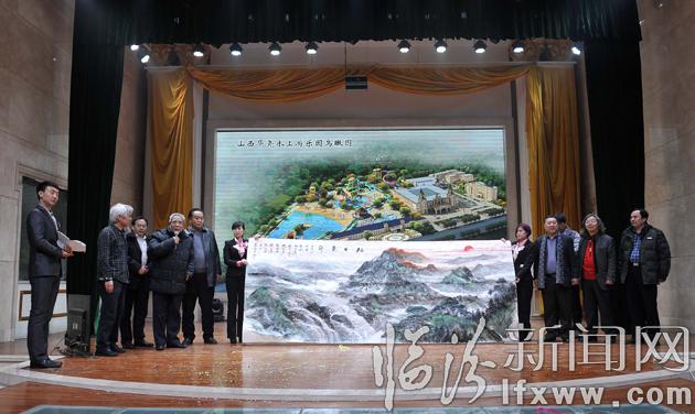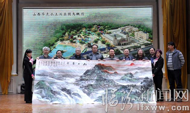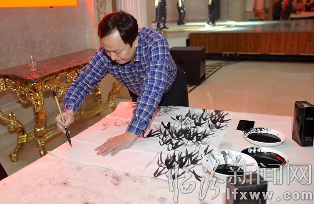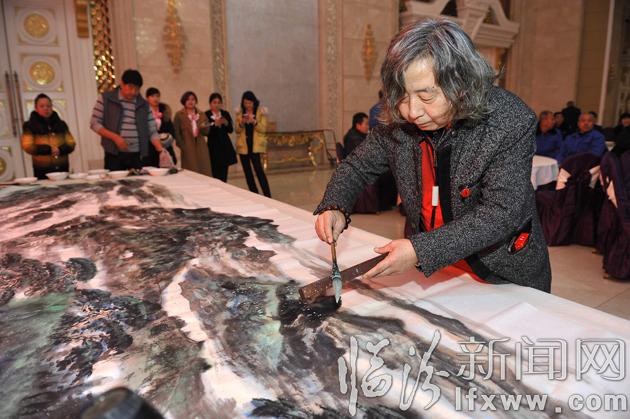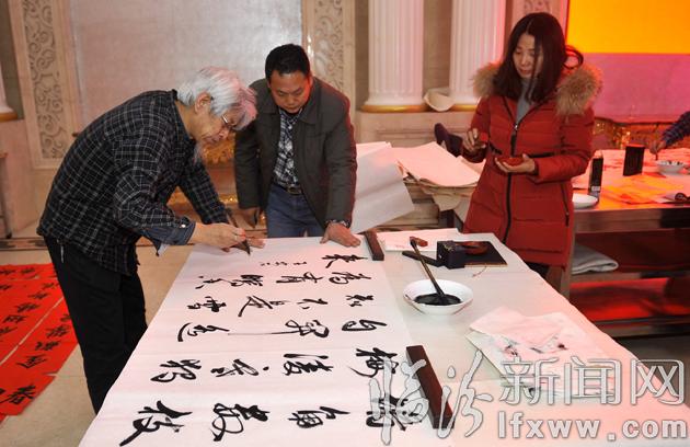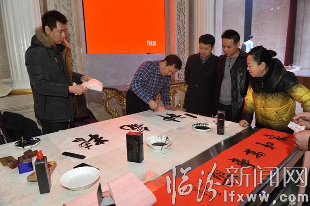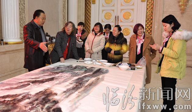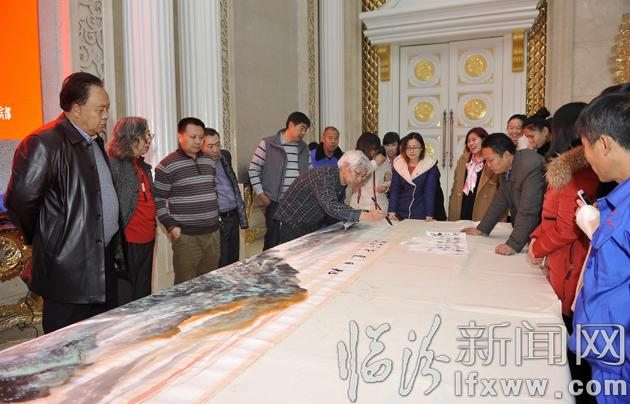 1月2日,在我市华尧集团,来自北京湖社画会的书画家在现场创作书画作品。当日,山西华尧集团举行了一场特殊的迎新春团拜会,邀请了北京湖社画会的10余名书画家和华尧集团600余名员工共庆新年,活动现场,书画家结合临汾的丰厚历史底蕴,现场创作了巨幅山水画卷,并为员工书写了新年春联,华尧集团的员工也自编自导了舞蹈、魔术以及小品等精彩的文艺节目,在浓浓的书香气氛中,喜迎新春的到来。