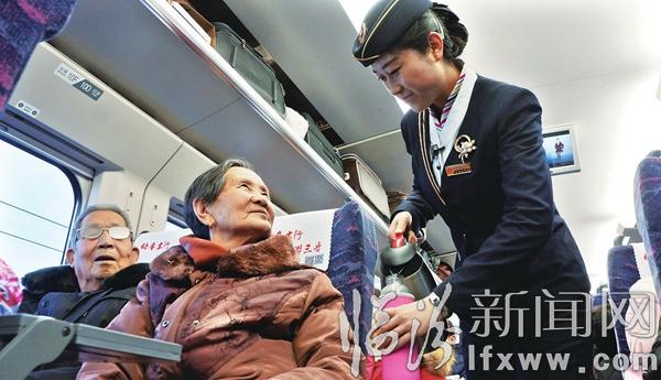 临汾新闻网讯 1月23日,在太原开往运城的D5315列车上,太原铁路局乘务员王丽正在为老年人提供饮水服务。2016年春运于1月24日正式启动,历时40天。春运期间,太原铁路局客运段D5315列车二组将开展“亲情满车厢,温暖在旅程”活动。