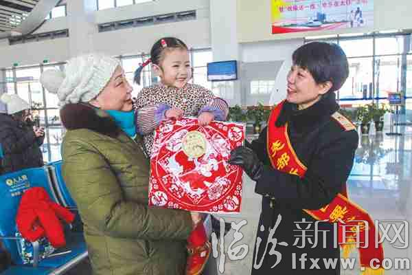 临汾新闻网讯 “小朋友,送你一个剪纸,祝你们旅途愉快!”谢谢阿姨……”1月24日,春运首日,临汾西站的工作人员为旅客送上了窗花剪纸和旅客乘车须知等,并祝愿各位旅客旅行愉快。今年春运,临汾西站特别推出“三导三帮”便民服务措施等,由原来的10项便民服务,拓展为15项便民服务,最大限度方便旅客,实现旅客安全、温馨出行。