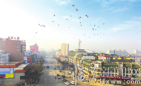 临汾新闻网讯 2月17日,一群鸽子在鼓楼南大街上空自由飞翔。