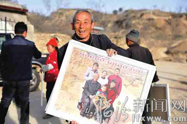 临汾新闻网讯 日前,永和县阁底乡奇奇里村的村民收到全家福后分外喜悦。由中国工商银行临汾分行举办的“圆山区百姓团圆梦”爱心公益行活动开展以来,为全村的村民拍摄全家福照片,经过工作人员加班加点认真设计、装框,一幅幅充满爱心的全家福送到了村民手中。 记者 闫锐鹏 摄
