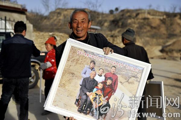 临汾新闻网讯 用影像记录亲情,用照片温暖人心,农历腊月二十七,永和县阁底乡奇奇里村的村民们收到了充满着爱心的一幅幅全家福,得知志愿者们要过来送照片了,乡亲们早早就聚在村委会的大院里等待着,和第一次到奇奇里村一样,村民们拿出了自家的红枣、核桃,用农村那份特有的热情招待远道而来的客人。