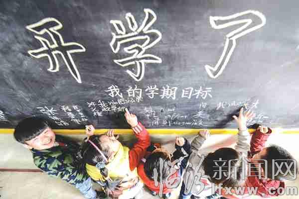 临汾新闻网讯 2月23日(正月十六),我市中小学校寒假结束,迎来了春季开学报到日。全市各个学校准备了丰富多彩的“开学第一课”。图为解放路小学一年级7班的小学生在黑板上书写新学期目标。