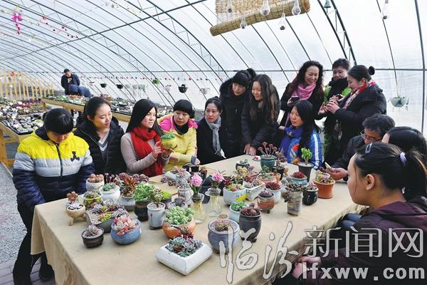 临汾新闻网讯 3月8日,在我市“花事未了”多肉植物园,花艺师汤荣(左三)在为爱好者讲授多肉植物的种植技巧。“三八”节期间,为了提升女性的审美情趣和文化素养,该植物园开办了“多肉手作课堂”,教授学员盆花的种养技术,让她们把春天的气息带回家。