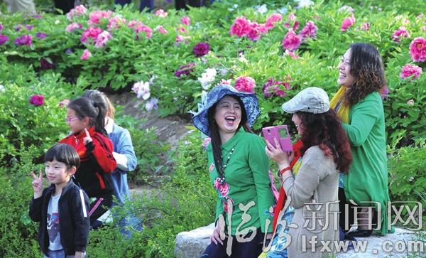 临汾新闻网讯 4月24日,在临汾汾河景区牡丹园,众多市民在园区拍照留念。连日来,市区汾河景区牡丹园花期正旺,竞相绽放,成为市民休闲旅游的好去处,吸引了众多市民、游客前去赏花、踏青。 记者 闫锐鹏 摄