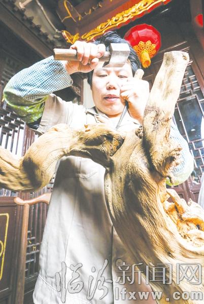 临汾新闻网讯 5月8日,传统手工木雕艺人正在制作根雕,展示手工技艺。