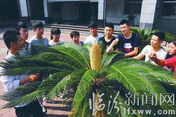 临汾新闻网讯 日前,山西信息职业技术学院内的一雌一雄铁树同时开花,吸引了周围众多的市民前来参观拍照,形成了校园里一道靓丽的风景线。该院共有十余株铁树,2010年8月8日,第一株铁树开花;2014年6月13日,有两株铁树同时开花;2015年6月12日,也有两株铁树开花,没想到今年又有两株开花。铁树连年开花的奇景不仅让师生们惊叹,而且带给他们积极奋进的信心和前程似锦的美好祝福。(马尧)