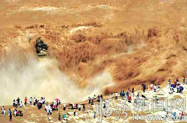 临汾新闻网讯 7月21日,游客在吉县黄河壶口瀑布景区游览。近日,受上游强降雨影响,黄河干流晋陕峡谷水势大涨,壶口瀑布迎来伏汛,主副瀑布连成一片,水流湍急,惊涛拍岸,展现出诗人描写的“黄河天下险,壶口最惊人,飞流撼天地,涛声泣鬼神。”壮丽景观,吸引了众多游客和摄影爱好者。 记者 李虎威 郑远飞 摄