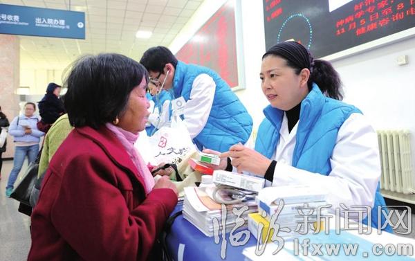 临汾新闻网讯 11月8日,在第十个“联合国糖尿病日”来临之际,市中心医院开展主题为“着眼糖尿病”的宣传义诊活动,内分泌科的医护人员身着寓意“蓝光行动”的蓝色马甲,向前来就诊的市民免费检测血糖、测量血压,进行糖尿病筛查。活动为500余人次进行了义诊,并向广大市民宣传了糖尿病的危害、预防措施等知识。图为内分泌科主任孟晓萍正在为糖尿病患者义诊。