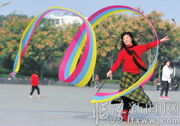 临汾新闻网讯 连日来,在市区鼓楼广场,每天都能看到彩绸舞爱好者迎着朝霞舞动彩绸的身影,大家伴着音乐翩翩起舞,成为广场上一道亮丽的风景线。 记者 闫锐鹏 摄