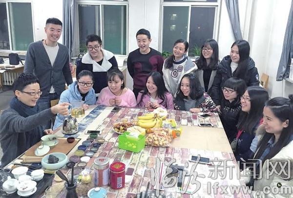 临汾新闻网讯 12月6日,在山西师范大学美术学院,硕士研究生导师宋雪梅在为学生讲授茶道文化。宋雪梅将茶道文化有机融入了书法、古典音乐、历史、养生等各种文化知识中,在扩展学生知识面的同时,让大学生们领略到了茶艺的文化魅力。 记者 闫锐鹏 摄
