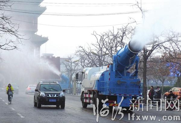 临汾新闻网讯 12月4日,在市区鼓楼东大街,高压喷雾抑尘车正在作业。连日来,我市多部门联合,通过加大天气会商、机动车限行以及环保和环卫部门在市区主干街道实施交叉除尘、洒水作业等措施,全力以赴应对雾霾天气。