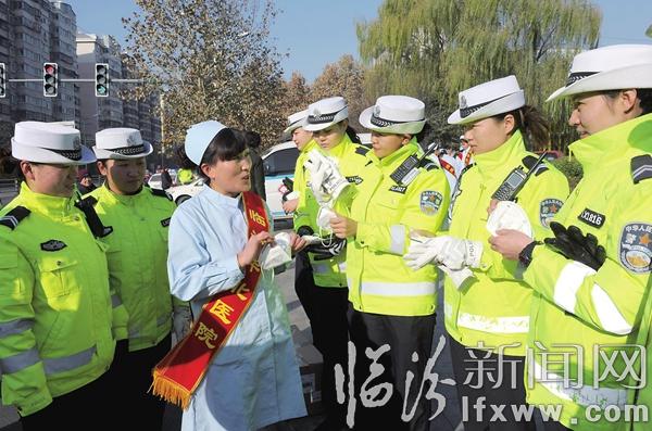 临汾新闻网讯 12月8日,市公安局交警支队北城大队的执勤民警收到了临汾华北医院捐赠的防雾霾口罩。当日,临汾华北医院开展了“情系一线交警,爱心在行动”主题活动,为市公安局交警支队一线执勤民警捐赠了2400余副防雾霾口罩,感谢他们为城市交通做出的努力。 记者 闫锐鹏 摄