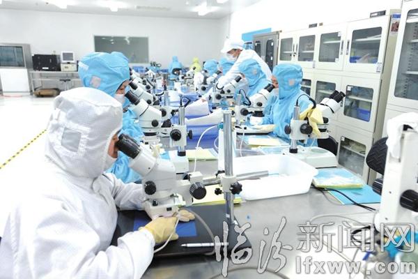 临汾新闻网讯 近日,在山西飞虹微纳米光电科技有限公司,工作人员正在加工LED芯片。该企业是一家以研发、生产和销售大功率白光LED用化合物半导体(高亮度)外延片、芯片以及LED照明灯具等产品的高新技术企业,年产值可达100亿元,同时带动下游企业实现年产值150亿元。 记者 魏华 摄