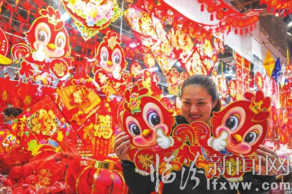 临汾新闻网讯 随着元旦、春节的临近,各家饰品商铺门庭若市,火红的灯笼、中国结、年画、春联等新年装饰品销量大增。以鸡为造型的各类生肖饰品、摆件、挂件受到消费者的青睐。图为12月28日在新百汇,市民选择鸡年新年装饰品。