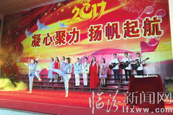 临汾新闻网讯 12月30日晚,临汾市第一中心学校举办元旦联欢晚会,由该校教师和学生自编自演的12场精彩纷呈的节目轮番上台进行了展示,向社会汇报了学校推行素质教育的丰硕成果。图为该校初中部的师生同台表演文艺节目。