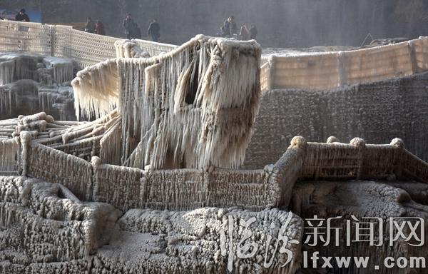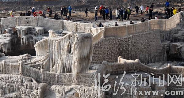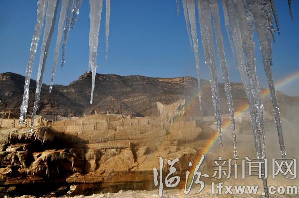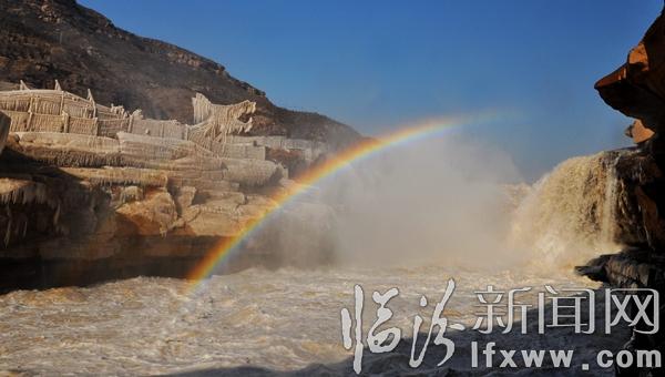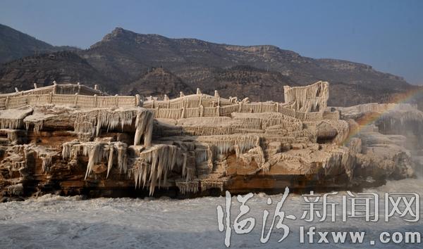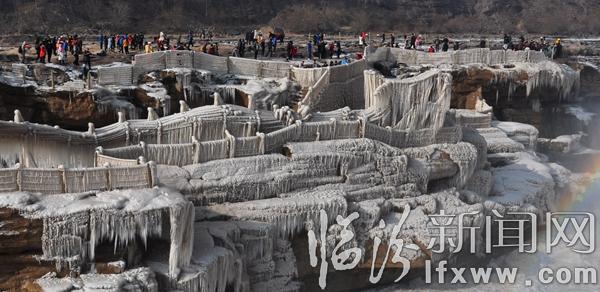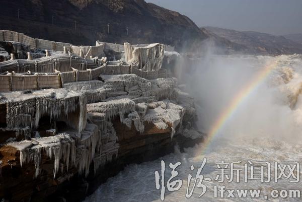 临汾新闻网讯 2017年1月3日,游客在山西吉县黄河壶口瀑布欣赏拍摄冰瀑冰雕景观。随着气温持续下降,山西吉县黄河壶口瀑布溅水成冰,层层叠叠的冰挂悬挂在瀑布两岸的岩石和护栏上,形成像巨龙一样奇特造型的冰瀑冰雕,与彩虹交相辉映,美轮美奂,吸引了众多游客和摄影爱好者。