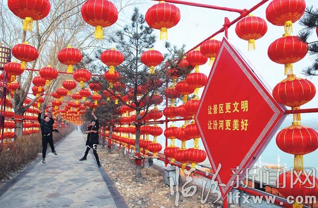 临汾新闻网讯 春节期间,游人正在市区汾河公园景区内游玩。火红的灯笼长廊与浮桥上悬挂着的红色“中国结”装饰标语交相辉映,增添了浓浓的节日氛围,市民在游玩的同时感受到浓浓的年味和文化味。