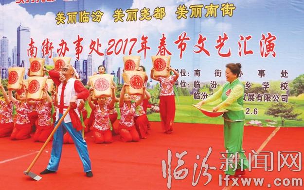 临汾新闻网讯 “火红的彩绸舞起来,喜庆的舞蹈跳起来。”2月6日,市区五一西路南街办事处门口,社区居民用自编自演的节目庆祝新春佳节。