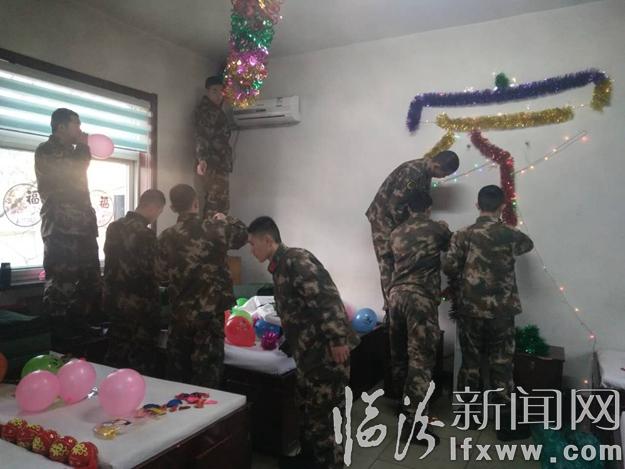 上午8点半,士兵们已经开始布置宿舍,十人一间的宿舍干净整洁,即使是为了迎新年做装扮,每个人也各有分工,全力合作保证效率和宿舍的规整。二排6班的张博捷是一个月前刚从新兵营分配到三中队的大学生新兵。张博捷不是第一次离家过年,上一次是还在上大一时和朋友们一起在玩闹中度过。“这次是和一起同吃同住的兄弟过年,而且大家都有责任在身,情感上更亲近。”第一次在部队过年,他说自己充满了好奇和期待,“想家人人都会想,特别是鞭炮声响起来的时候,热闹声中最觉得孤独。”