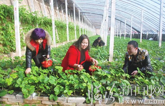 临汾新闻网讯 近日,在翼城县唐兴镇封比村草莓大棚内,游客正在采摘奶油草莓。这种大棚采用无土栽培,生物防治,生长的草莓个大色艳、绿色无公害,吸引了许多游客进园采摘,有力地促进了农民增收。记者 李自强 摄