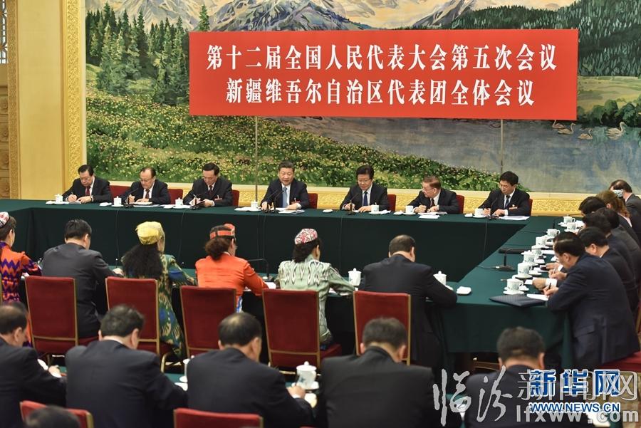 3月10日,中共中央总书记、国家主席、中央军委主席习近平参加十二届全国人大五次会议新疆代表团的审议。新华社记者 李涛 摄