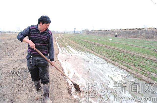 临汾新闻网讯 日前,曲沃县曲村镇下坞村农民杜五四正在灌溉自家的10亩小麦。大地回春,气温有了明显的回升,该县农民抓住有利时机开始忙着给小麦施肥、浇水、锄草,力争今年有个好收成。