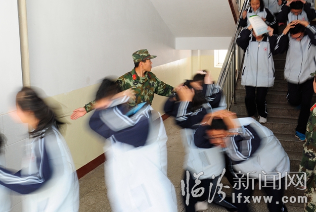 临汾新闻网讯 5月12日,消防战士对临汾一中学生进行安全疏散。
