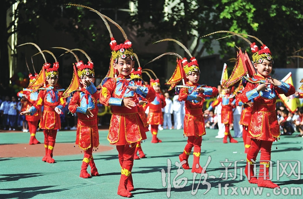 临汾新闻网讯 6月1日,在我市解放路小学,学生们在表演戏曲《锦绣梨园》。