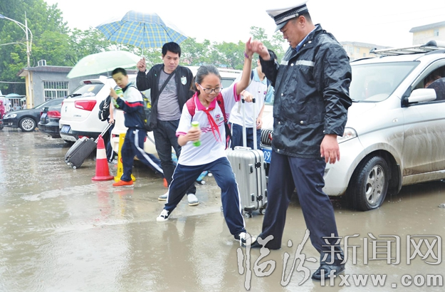 当日,由于市区新华中学门口路面积水严重,为了不让孩子们湿了鞋,一名执勤民警主动踩到水里,让孩子们踩着他的脚越过积水。民警们虽然穿着雨衣,但在持续的降雨中,雨衣也阻挡不了长时间的浸泡,雨水顺着他们的帽子流进脖子里,衣服和鞋都湿透了,可他们依然坚守岗位,疏导交通,过往的群众看到雨中坚守的民警纷纷为他们点赞。