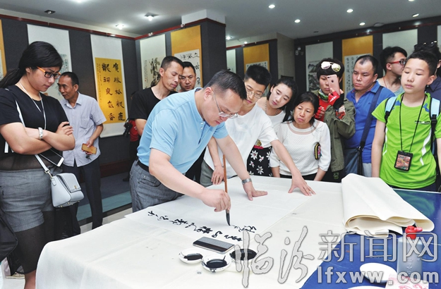 临汾新闻网讯 近日,在市群众艺术馆,来自台湾、临汾两岸书画艺术工作者在进行书法交流笔会。由市文联倡导会同台湾花莲县美术协会组织的“2017海峡两岸艺术论坛暨书画展”日前在我市举办,共展出台湾、临汾两岸书画艺术工作者作品80余件,展示了两岸书画艺术家们精湛的笔墨技艺和两岸人民同根同祖的血脉相承。 记者 闫锐鹏摄