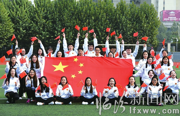 临汾新闻网讯 10月13日,在山西师范大学现代文理学院,学生们在和国旗合影。