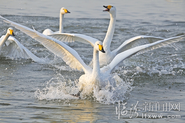 临汾新闻网讯 邱启明是记者的好友,他介绍,今年天鹅从西伯利亚来得早,选一个好天气一起去平陆拍天鹅。11月30日一大早,记者和好友邱启明收拾行装,赶到平陆三湾村天鹅湿地公园。在观鸟台,聚集了来自全国各地的游客与拍鸟人,长枪、短炮”一字排开,快门声与天鹅的鸣叫声交织在一起,犹如交响曲回荡在湿地公园。12月3日,邱先生发来一组照片,记录了天鹅在湿地公园愉快生活的一天。