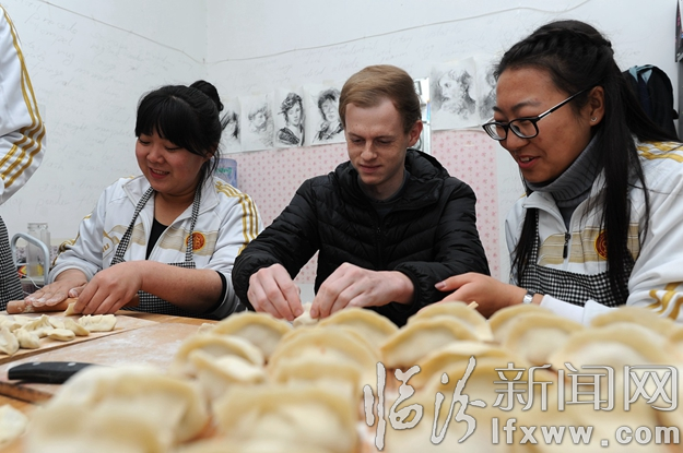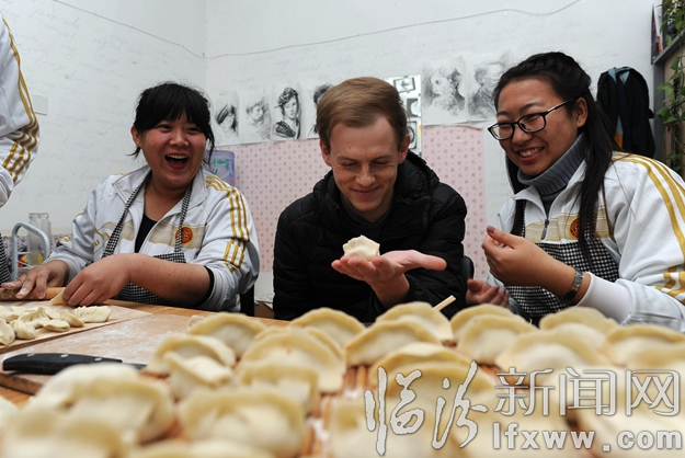 临汾新闻网讯 12月20日,山西师范大学现代文理学院数学与计算机系,乌克兰留学生奥斯汀(右一)、沙特阿拉伯留学生艾迪(左二)与同学们一起包饺子。冬至来临之际,该学院数学与计算机系举办了“暖暖的饺子,暖暖的心”迎冬至活动,让来自不同国家和地区的学子在分享快乐的同时,了解冬至的传统习俗。