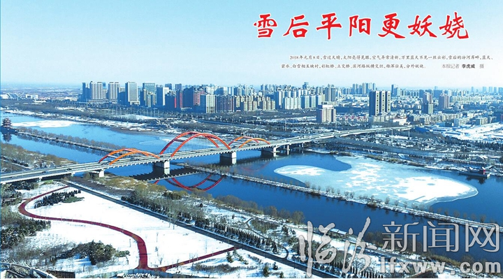 临汾新闻网讯 2018年元月8日,雪过天晴,太阳亮得晃眼,空气异常清新,万里蓝天不见一丝云彩,雪后的汾河岸畔,蓝天、碧水、白雪相互映衬,彩虹桥、立交桥、滨河路纵横交织,雄浑壮美,分外妖娆。