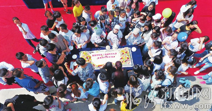 临汾新闻网讯 5月27日,山西师范大学食品科学学院在该校巨人广场举行了主题为“弦歌不辍一甲子,美食飘香晋师园”的美食文化节活动。为庆祝该校建校60周年,丰富校园文化生活,学子们制作了巨型大蛋糕,分发给过往同学,并准备了各种小游戏,吸引了众多师生参与。